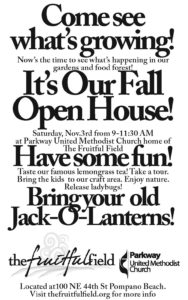Dear Fruitful Field Friend, If you haven’t helped on a workday recently or visited the garden in a few months here’s your chance to see what’s Growing!! Saturday, November 5th from 8:30 am to 1:00 pm we are having a “Fall Tour” in conjunction with church and neighborhood So…. Stop on by and– Bring …